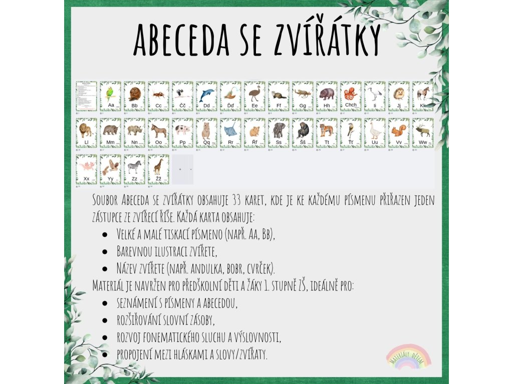 Soubor Abeceda se zvířátky obsahuje 33 karet, kde je ke každému písmenu přiřazen jeden zástupce ze zvířecí říše. Každá karta obsahuje: