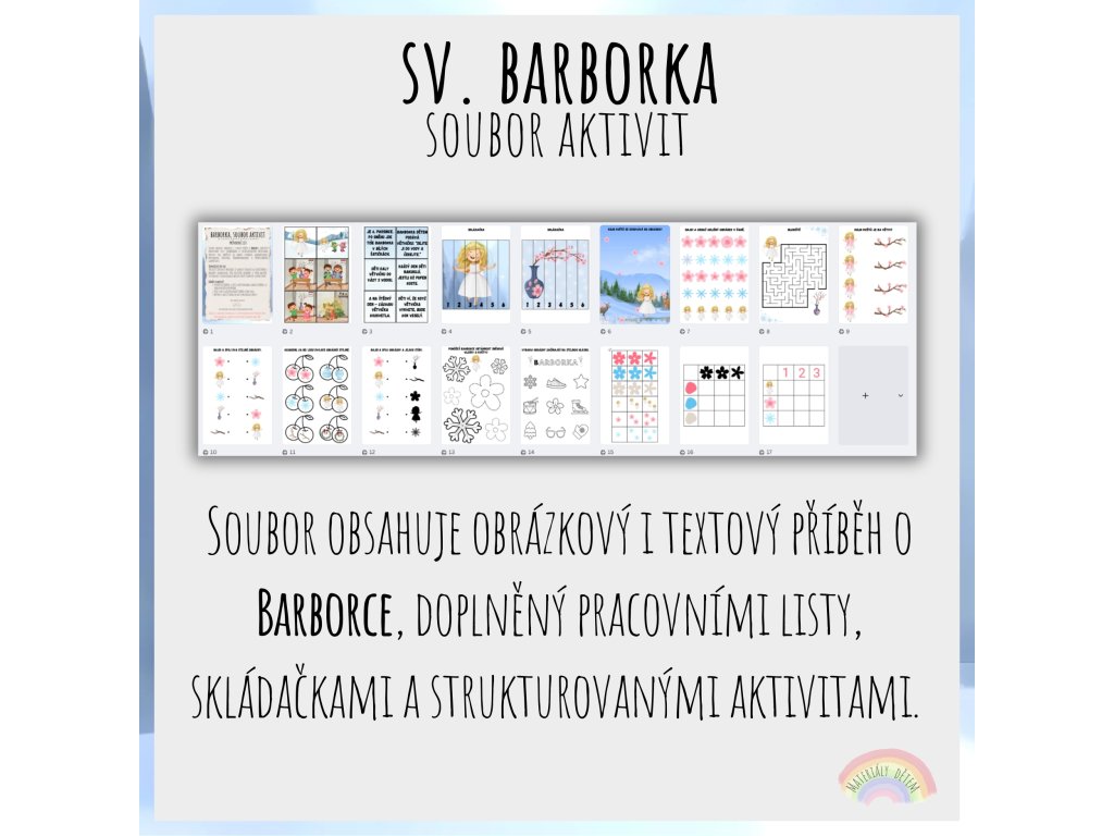Soubor obsahuje obrázkový i textový příběh o Barborce, doplněný pracovními listy, skládačkami a strukturovanými aktivitami. Aktivity jsou zaměřené na zrakové vnímání, grafomotoriku, prostorovou orientaci, předmatematickou a předčtenářskou gramotnost.