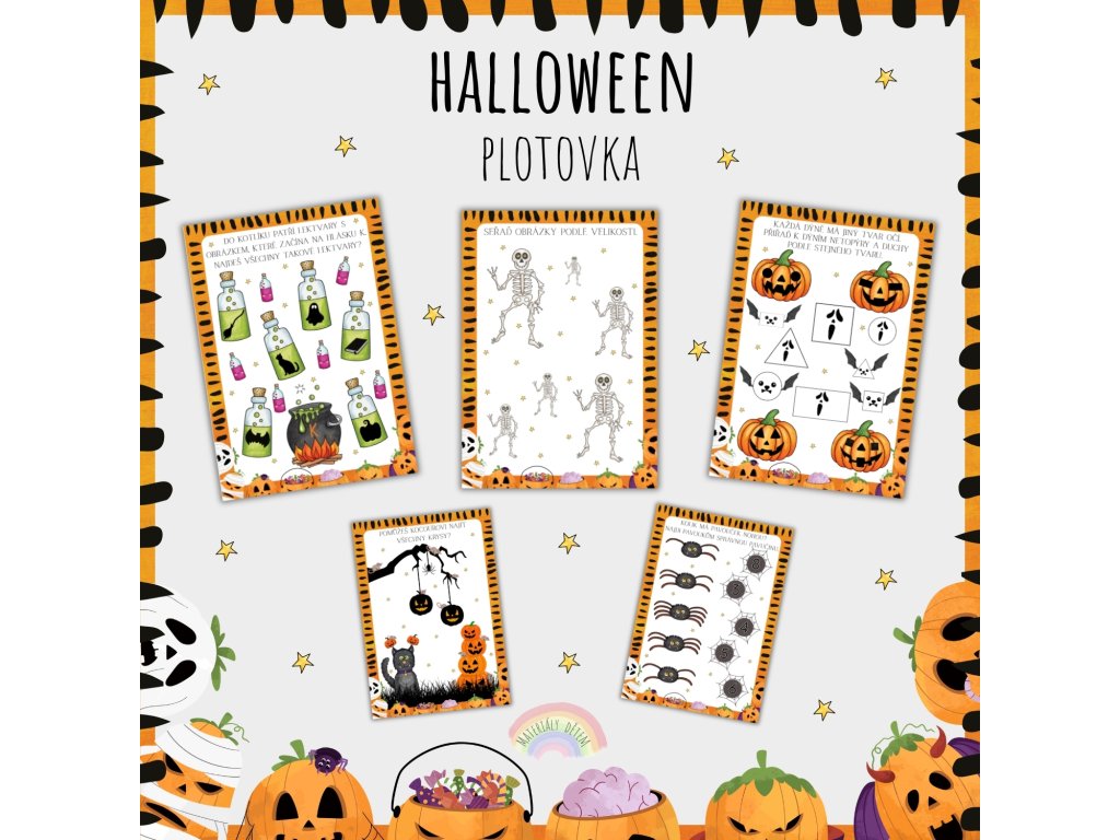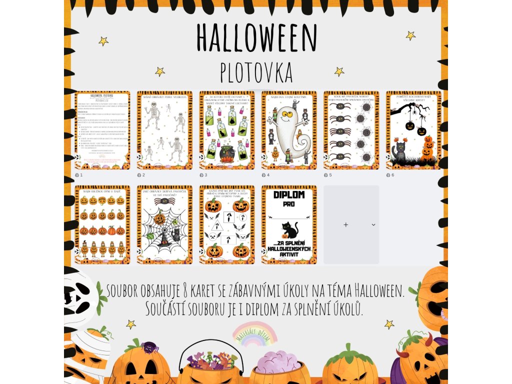 Soubor obsahuje 8 karet se zábavnými úkoly na téma Halloween. Součástí souboru je i diplom za splnění úkolů. Pomocí hravých úkolů si děti procvičí nejen zrakové a sluchové vnímání, ale také předmatematické dovednosti, prostorovou orientaci a logické myšlení.