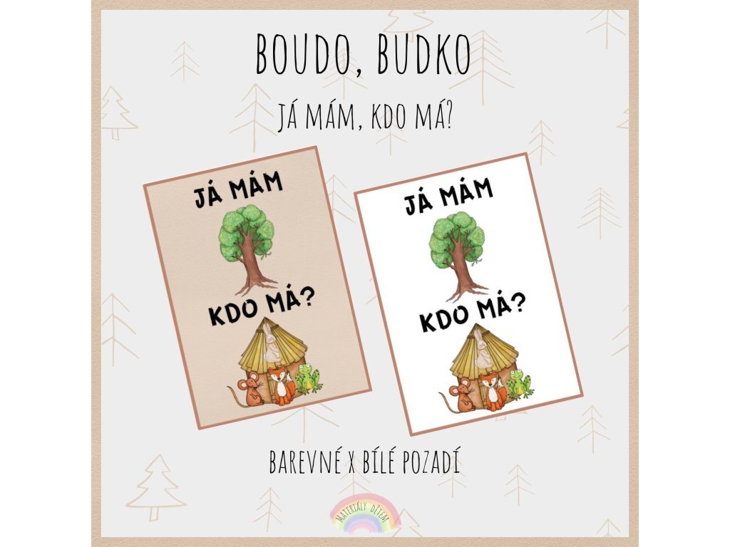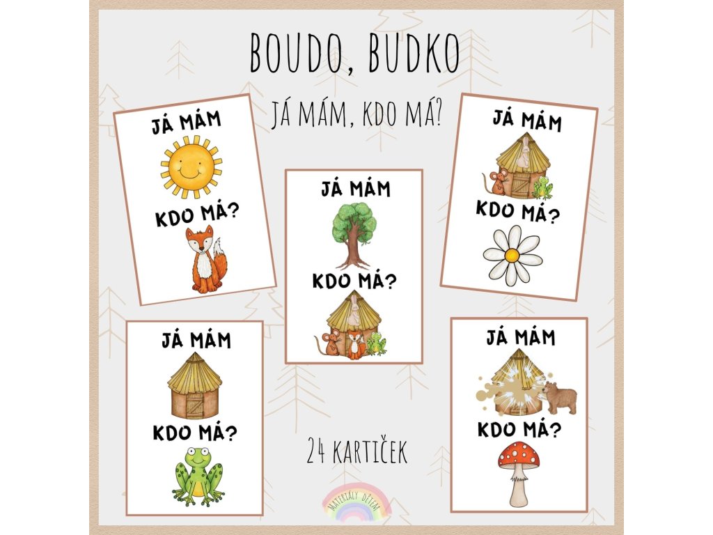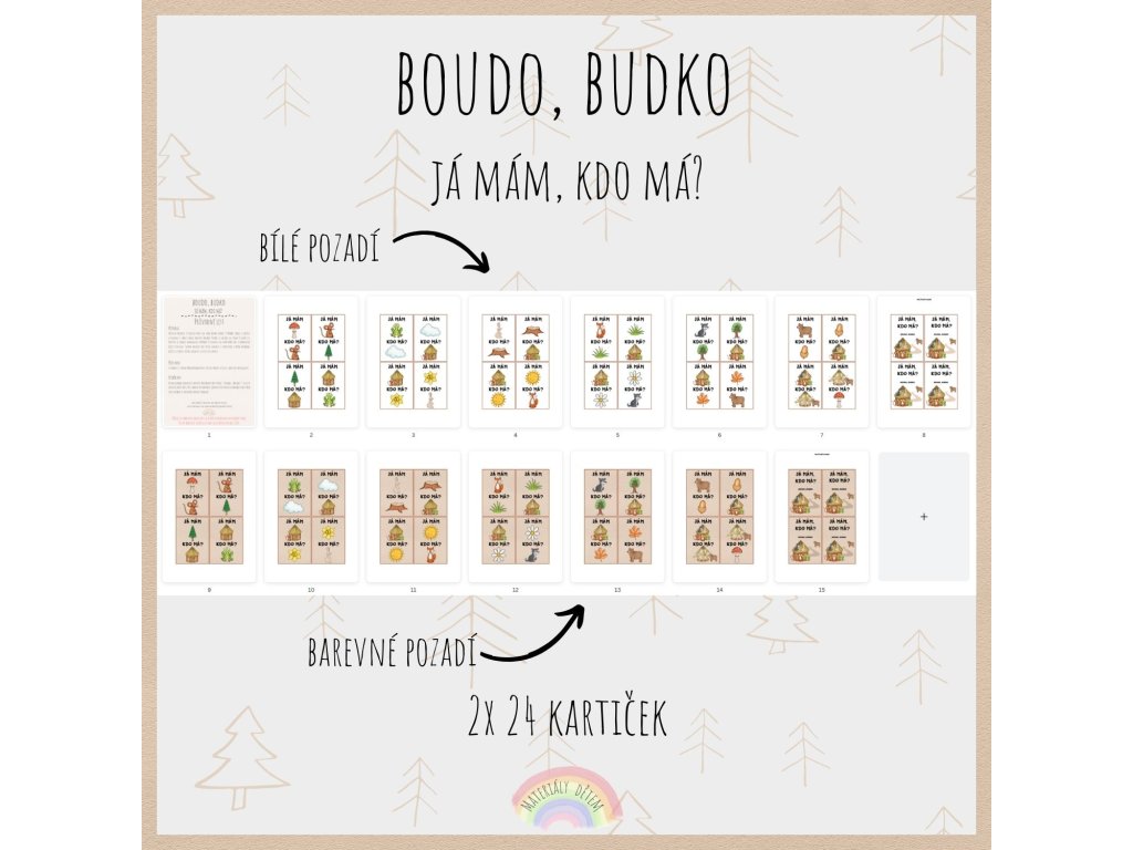 Aktivita obsahuje 24 hracích karet na téma Boudo, budko. V případě zájmu si můžete vytisknout i zadní stranu kartiček (pozadí). Pozadí se nachází na straně 8 (nebo 15). Kartičky je vhodné zalaminovat, případně vytisknout na tvrdý papír, aby se prodloužila jejich životnost. Soubor obsahuje dvě různé varianty (s barevným a bílým pozadím). můžete si vybrat, kterou variantu si chcete vytisknout.