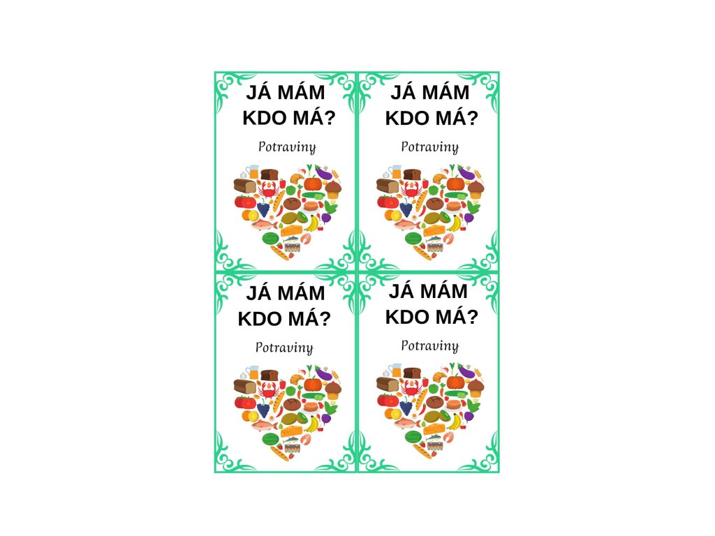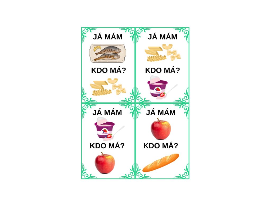 Dětem rozdáme jednotlivé kartičky. Následovně děti říkají: "Já mám.., kdo má...?" a na to navazují další děti. Hra rozvijí slovní zásobu, paměť, zrakovou a sluchovou percepci. Děti mohou po odehrání jednotlivých kartiček odkládat karty před sebe a skládat je tak do postupného "domina".