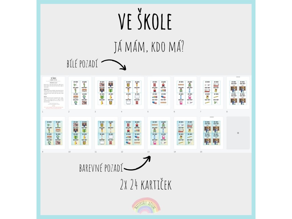 Aktivita obsahuje 24 hracích karet na téma Ve škole. V případě zájmu si můžete vytisknout i zadní stranu kartiček (pozadí). Pozadí se nachází na straně 8 (nebo 15). Kartičky je vhodné zalaminovat, případně vytisknout na tvrdý papír, aby se prodloužila jejich životnost. Soubor obsahuje dvě různé varianty (s barevným a bílým pozadím). Můžete si vybrat, kterou variantu si chcete vytisknout.