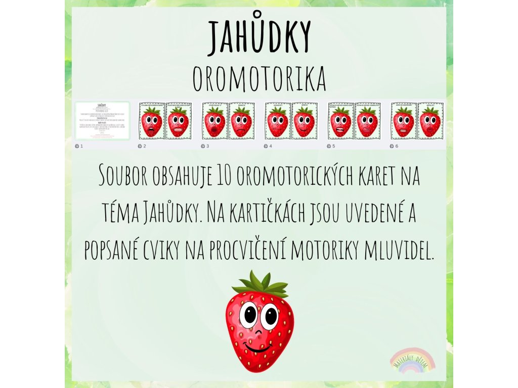 Soubor obsahuje 10 oromotorických karet na téma Jahůdky. Na kartičkách jsou uvedené a popsané cviky na procvičení motoriky mluvidel.