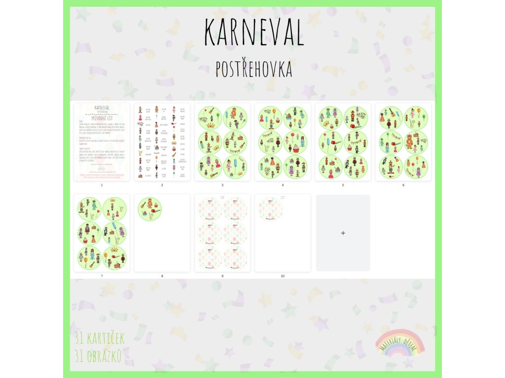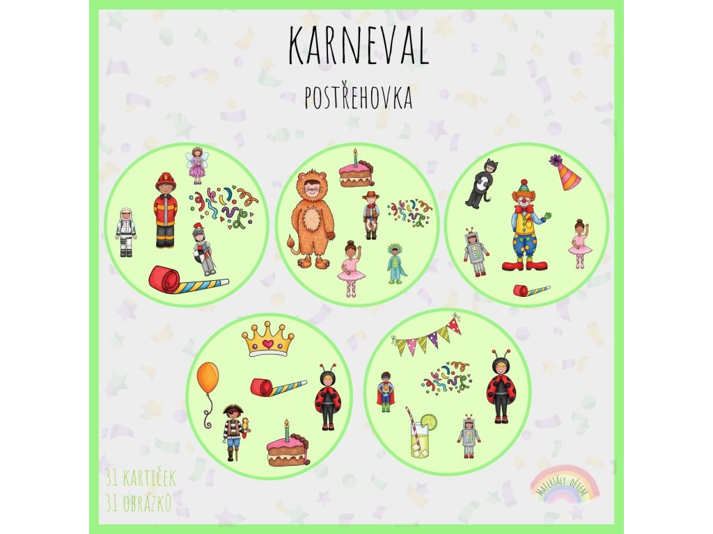 Soubor obsahuje 31 herních kartiček (koleček) s celkem 31 obrázky na téma Karneval. Součástí materiálu je také obrázkový obsah včetně popisu obrázků. Aktivita je zaměřena na rozvoj slovní zásoby, rychlosti a pozornosti. Cílem hry je najít na dvojici kartiček jeden stejný obrázek.