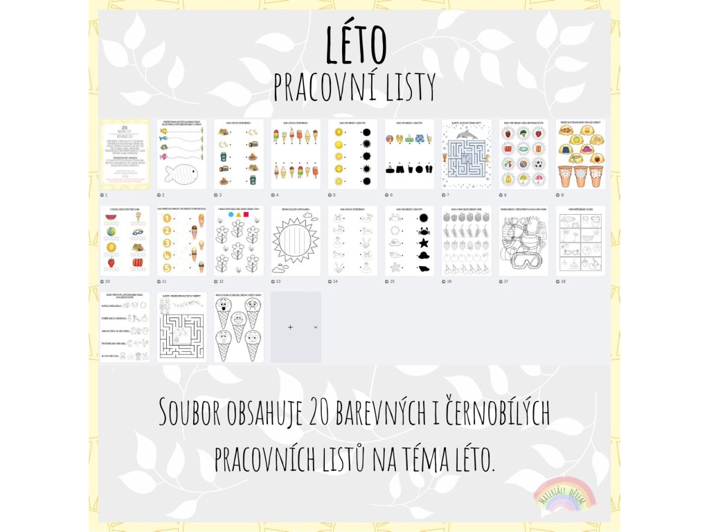 Soubor obsahuje 20 pracovních listů s letní tematikou, které podporují rozvoj klíčových oblastí předškolního vzdělávání. Prostřednictvím jednotlivých úkolů si děti procvičí zrakové vnímání, grafomotoriku, předmatematickou a předčtenářskou gramotnost, sluchové a prostorové vnímání a oromotoriku.