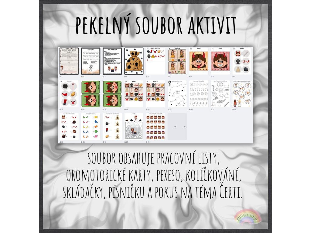 Soubor obsahuje pracovní listy, oromotorické karty, pexeso, kolíčkování, skládačky, písničku a pokus na téma Čerti. Aktivity jsou zaměřené na rozvoj grafomotoriky, zrakového a sluchového vnímání, prostorové orientace, předmatematické gramotnosti a jemné motoriky.