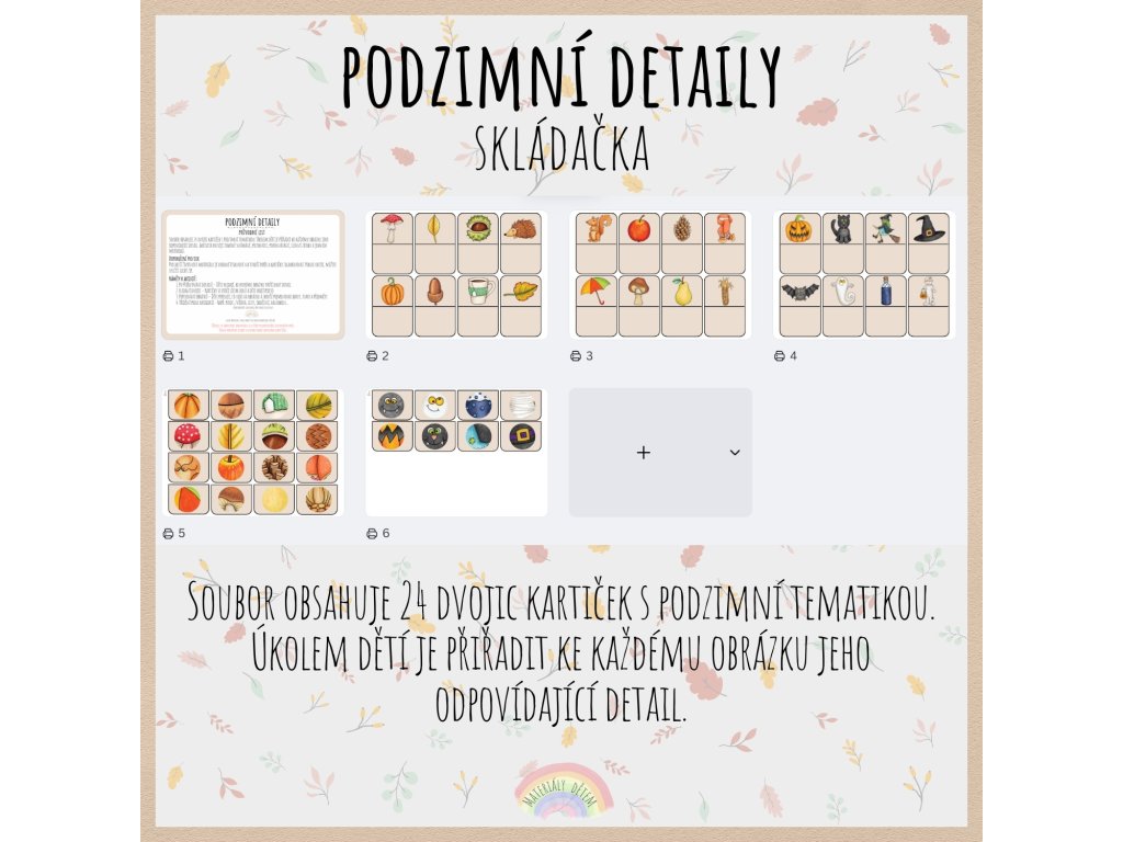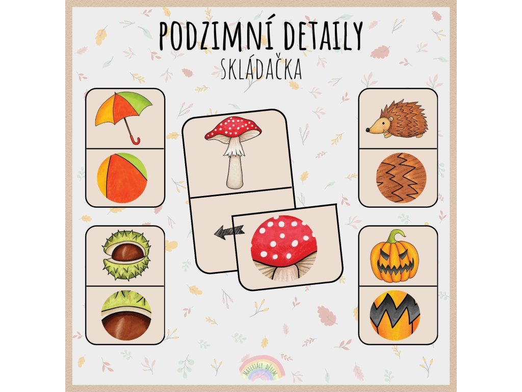 Soubor obsahuje 24 dvojic kartiček s podzimní tematikou. Úkolem dětí je přiřadit ke každému obrázku jeho odpovídající detail. Aktivita rozvíjí zrakové vnímání, pozornost, porovnávání, slovní zásobu a jemnou motoriku.