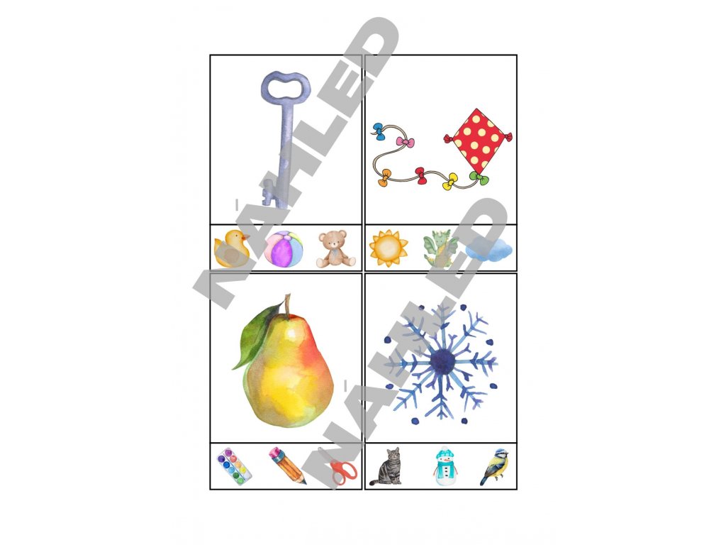 Aktivita obsahuje 28 kolíčkovacích kartiček na téma Rýmy. Kolíčkování je zaměřené na určení dvou obrázků, které se rýmují. Je dobré si s dětmi předem pojmenovat neznámé obrázky a vysvětlit si jejich význam.