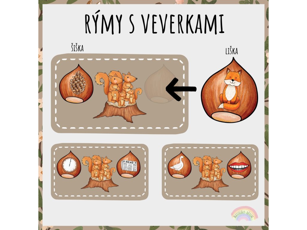 • Najdi správný oříšek: Děti si vezmou kartičku s veverkou a hledají oříšek, který se k ní rýmuje.