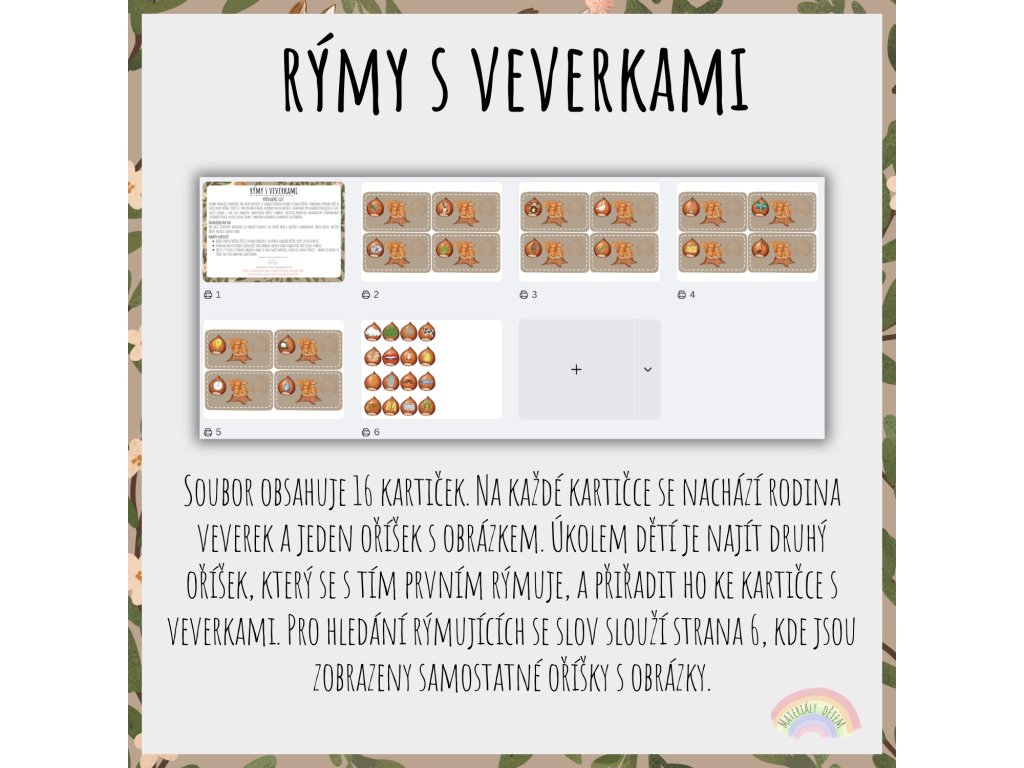 Soubor obsahuje 16 kartiček. Na každé kartičce se nachází rodina veverek a jeden oříšek s obrázkem. Úkolem dětí je najít druhý oříšek, který se s tím prvním rýmuje, a přiřadit ho ke kartičce s veverkami. Pro hledání rýmujících se slov slouží strana 6, kde jsou zobrazeny samostatné oříšky s obrázky.