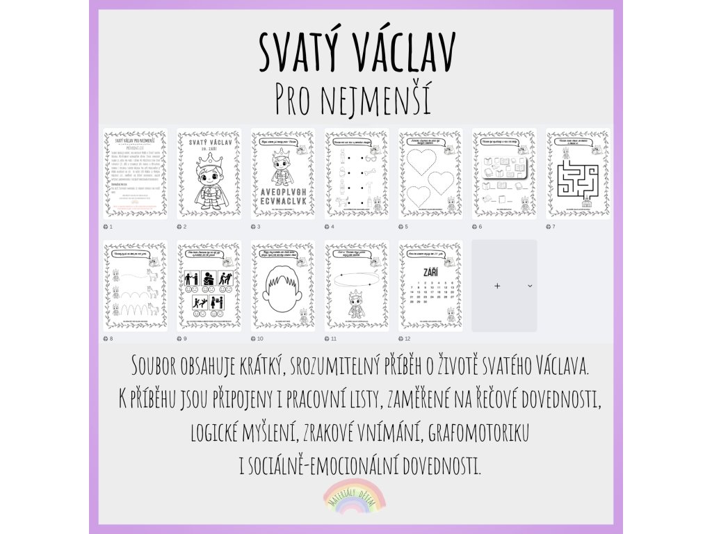 Tento tematický soubor je určen pro práci s dětmi při příležitosti Dne české státnosti (28. září) a seznamuje děti hravou a přístupnou formou s postavou svatého Václava. Pro lepší porozumění je příběh rozdělený do vět . Ke každé větě příběhu je připojen pracovní list, zaměřený na řečové dovednosti, logické myšlení, grafomotoriku i sociálně-emocionální dovednosti.