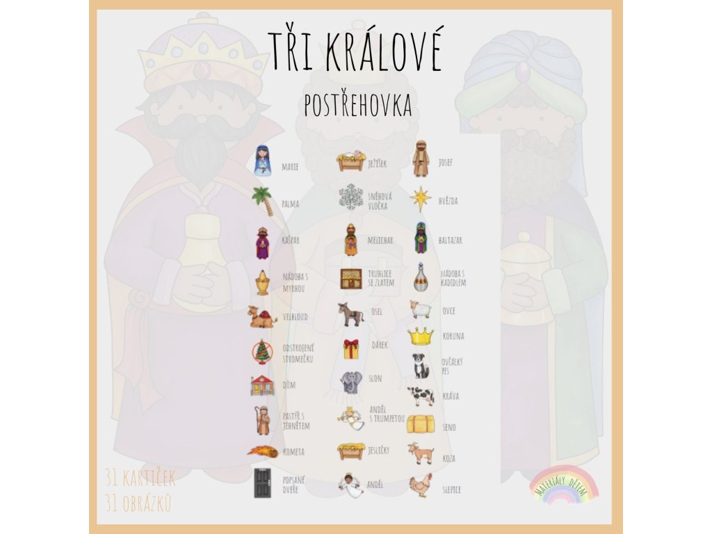 Soubor obsahuje 31 herních kartiček (koleček) s celkem 31 obrázky na téma tři králové. Součástí materiálu je také obrázkový obsah včetně popisu obrázků. Aktivita je zaměřena na rozvoj slovní zásoby, rychlosti a pozornosti. Cílem hry je najít na dvojici kartiček jeden stejný obrázek.
