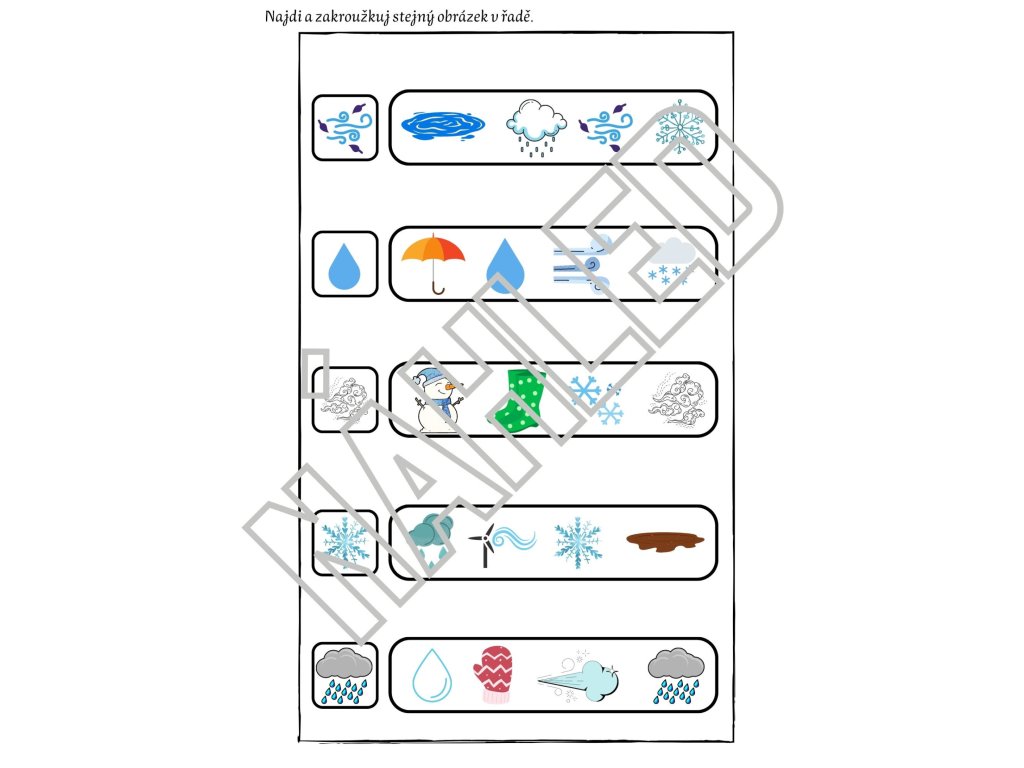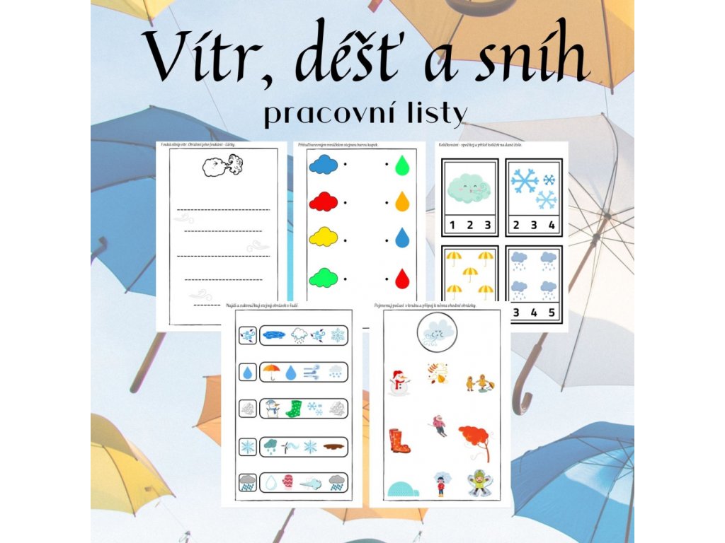 Soubor pracovních listů na téma Vítr, déšť a sníh, pro děti předškolního věku.