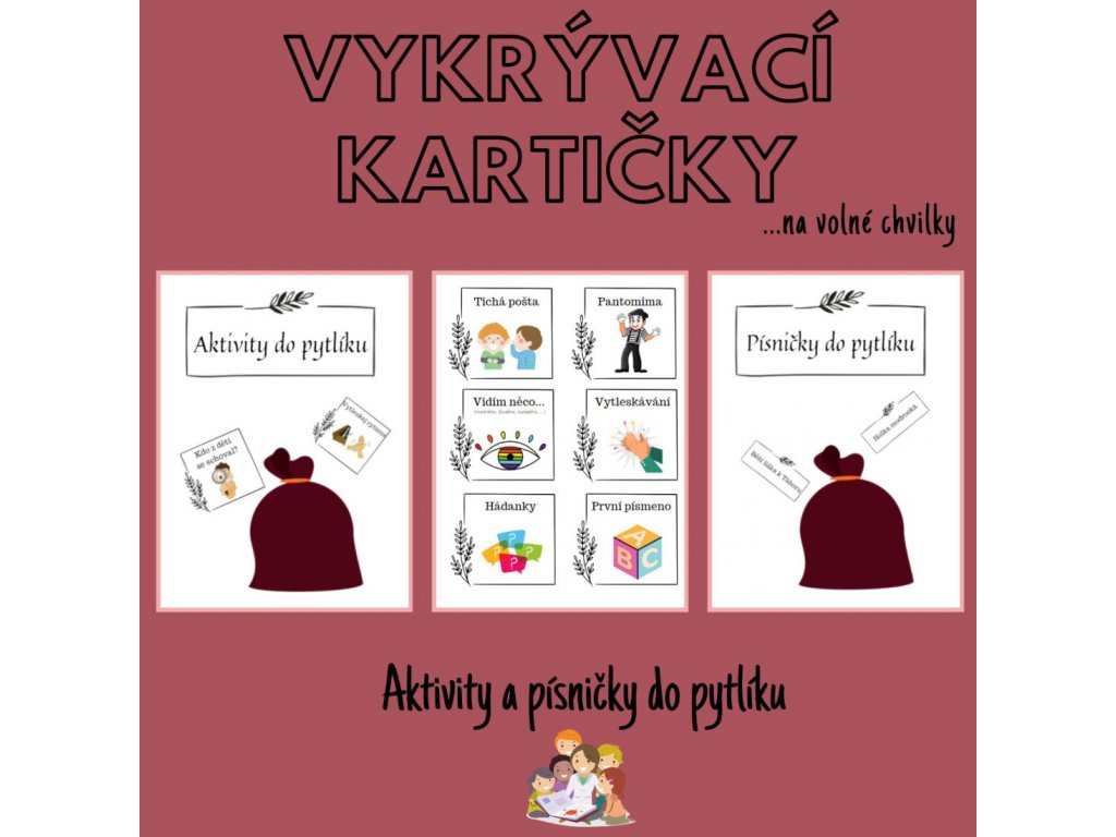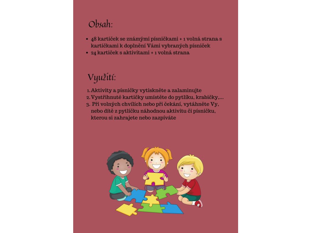 Soubor obsahuje známé dětské písničky a aktivity. Po nastříhání a zalaminování se kartičky dají se do pytlíku nebo krabičky. Kartičky můžete s dětmi využít při čekání, nebo během celého dne.