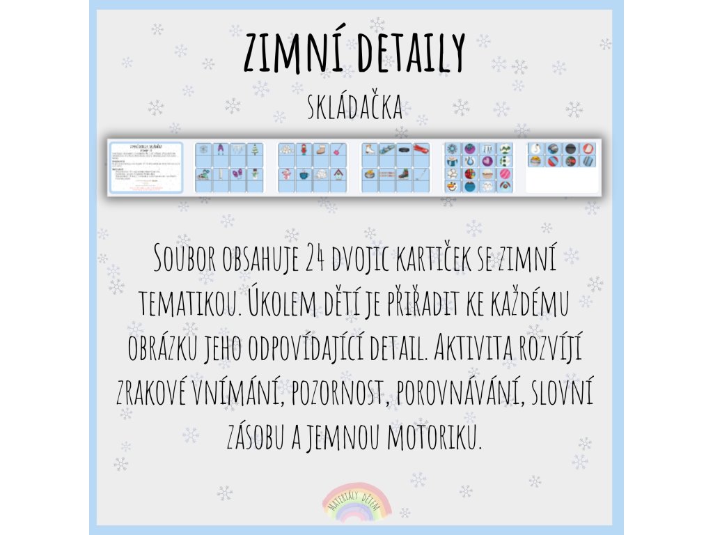 Soubor obsahuje 24 dvojic kartiček se zimní tematikou. Úkolem dětí je přiřadit ke každému obrázku jeho odpovídající detail. Aktivita rozvíjí zrakové vnímání, pozornost, porovnávání, slovní zásobu a jemnou motoriku.